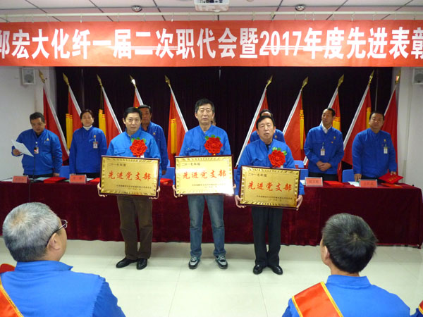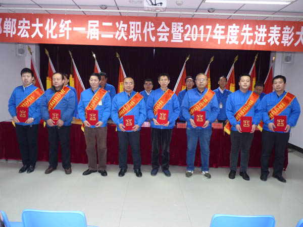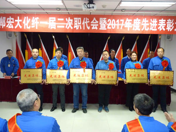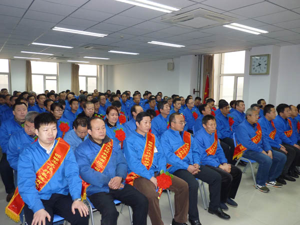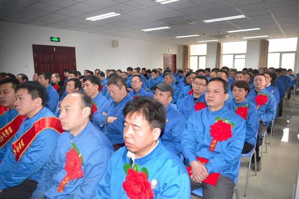 受到表彰的公司勞模、先進(jìn)個(gè)人、先進(jìn)集體代表披紅戴花在會(huì)場(chǎng)前排就座。