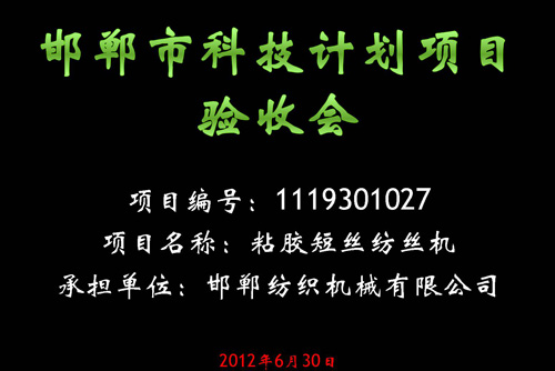 2012年6月30日,由邯鄲市科技局組織并主持,邀請(qǐng)有關(guān)專(zhuān)家組成驗(yàn)收委員會(huì),對(duì)邯鄲紡織機(jī)械有限公司承擔(dān)的2011年度邯鄲市科技重點(diǎn)項(xiàng)目“粘膠短絲紡絲機(jī)”(項(xiàng)目編號(hào):1119301027)進(jìn)行了驗(yàn)收。專(zhuān)家組認(rèn)真聽(tīng)取了項(xiàng)目承擔(dān)單位的工作報(bào)告、技術(shù)報(bào)告和專(zhuān)項(xiàng)資金審計(jì)報(bào)告,進(jìn)行了實(shí)地考察,經(jīng)討論形成如下意見(jiàn):
